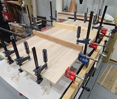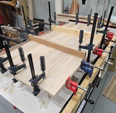 One very common place is to make panels. These panels can be used as shelves, casing sides, door frames, or table tops. Gluing multiple narrow(ish) pieces together gives the furniture more stability so it doesn’t warp or twist over time. Surprisingly, in applications like this, there is tons of research which shows the glue joint is stronger than the wood itself. If you were to drop a 500lb weight onto a modern table top, the wood would splinter and crack before the glue joint. All the clamps in the photo are to ensure a tight glue joint.