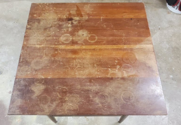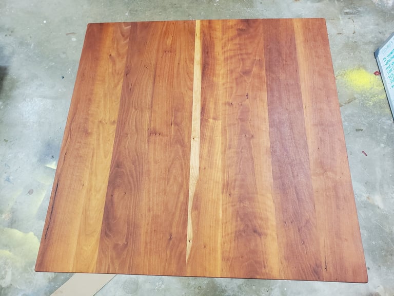 When we received it for free from a family member the top was in rough shape. But… it was 100% solid wood construction. That means I was able to sand it down and apply a hardwax oil finish. No stain here ladies and gentlemen, just pure cherry hardwood showing through. Beautiful, right? I then tightened up some of the fasteners and it will most likely see another 75 years of use.